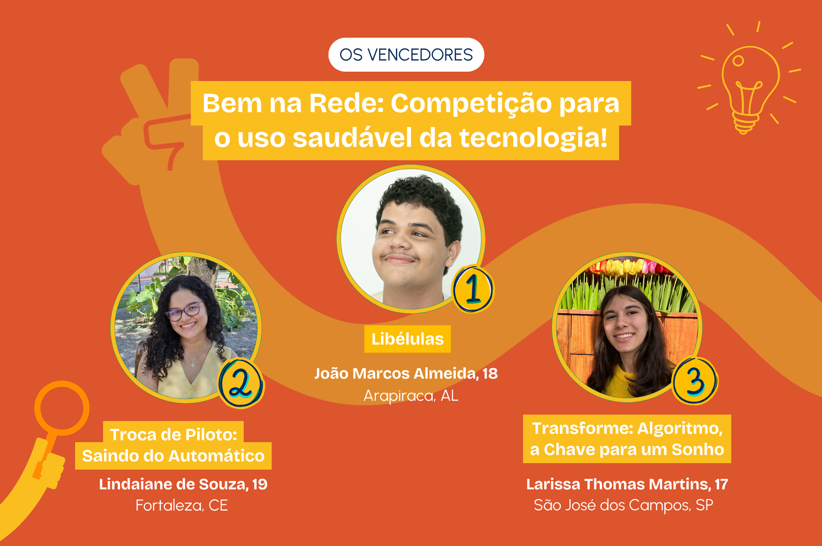 Os jovens premiados, que verão suas criações ajudando jovens em todo o país, são: João Marcos Almeida dos Santos, de Arapiraca (AL); Lindaiane de Souza Santos, de Fortaleza (CE); e Larissa Thomas Martins de Siqueira, de São José dos Campos (SP). Eles receberão prêmios de R$ 5.000, R$ 4.000 e R$ 3.000, respectivamente.